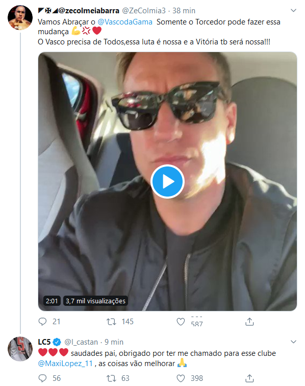 @ZeColmia3 @VascodaGama ❤️❤️❤️ saudades pai, obrigado por ter me chamado para esse clube @MaxiLopez_11 , as coisas vão melhorar ?