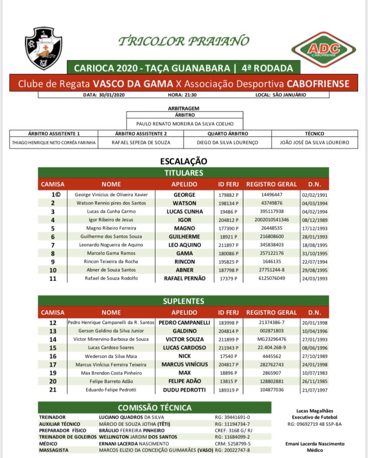 31/01/20 - Confira a escalação do Vasco para o jogo contra a Cabofriense