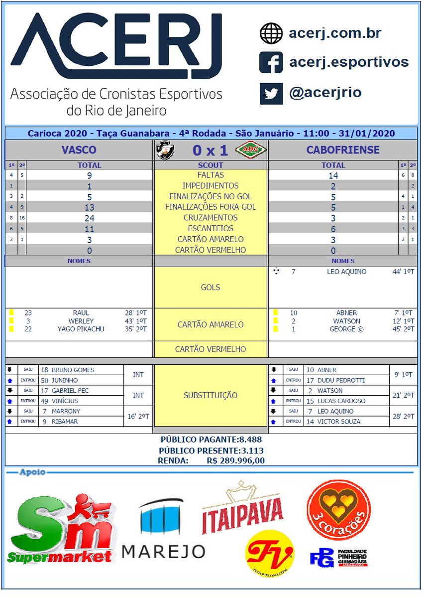Cartões amarelos: Raul, Yago Pikachu e Werley (Vasco); Abner, George e Watson (Cabofriense)