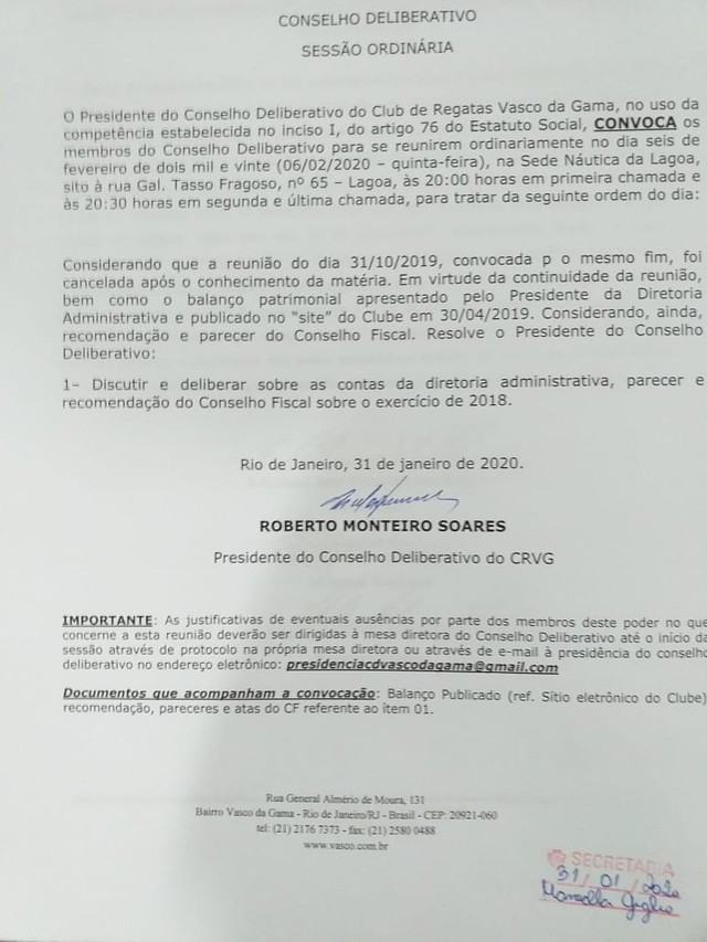 O Conselho Deliberativo do Vasco foi convocado para, na próxima quinta-feira, dia 6, analisar as contas de 2018 da gestão do presidente Alexandre Campello. O edital da sessão ordinária foi assinado nesta sexta-feira por Roberto Monteiro, presidente do Conselho Deliberativo.