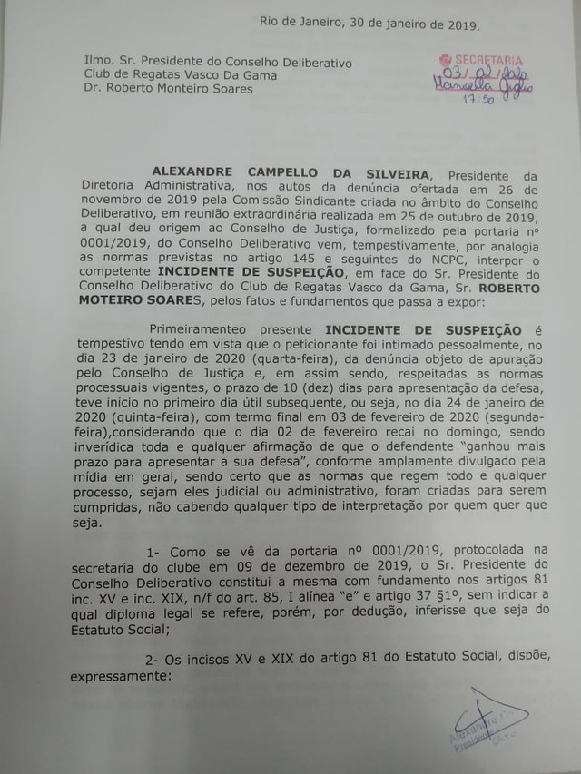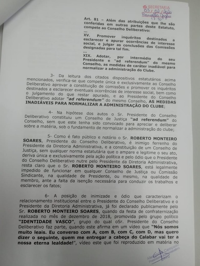 Campello ainda disse que Monteiro teve uma "interpretação divorciada das normas estatutárias" e instaurou a comissão de justiça sem aprovação do Conselho Deliberativo. Por isso, ela seria nula. O presidente do Vasco ainda afirmou que não criou obstáculos para o funcionamento da comissão de sindicância e tampouco desrespeitou os membros dela, afinal, a ata que aprovou os poderes da comissão foi aprovada em reunião no Conselho Deliberativo após o prazo de 30 dias para a conclusão dos trabalhos.