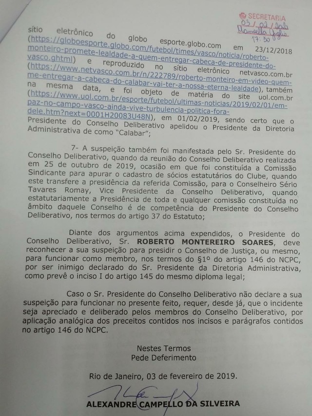Em documento protocolado na secretaria do clube, no fim da tarde desta segunda-feira, Campello alegou que Monteiro é seu inimigo público e declarado e que, portanto, não teria imparcialidade necessária para participar de um conselho que irá julgá-lo. O mandatário ainda solicitou que, caso Monteiro não declare a sua suspeição no caso, o pedido seja apreciado e deliberado por membros do Conselho Deliberativo.