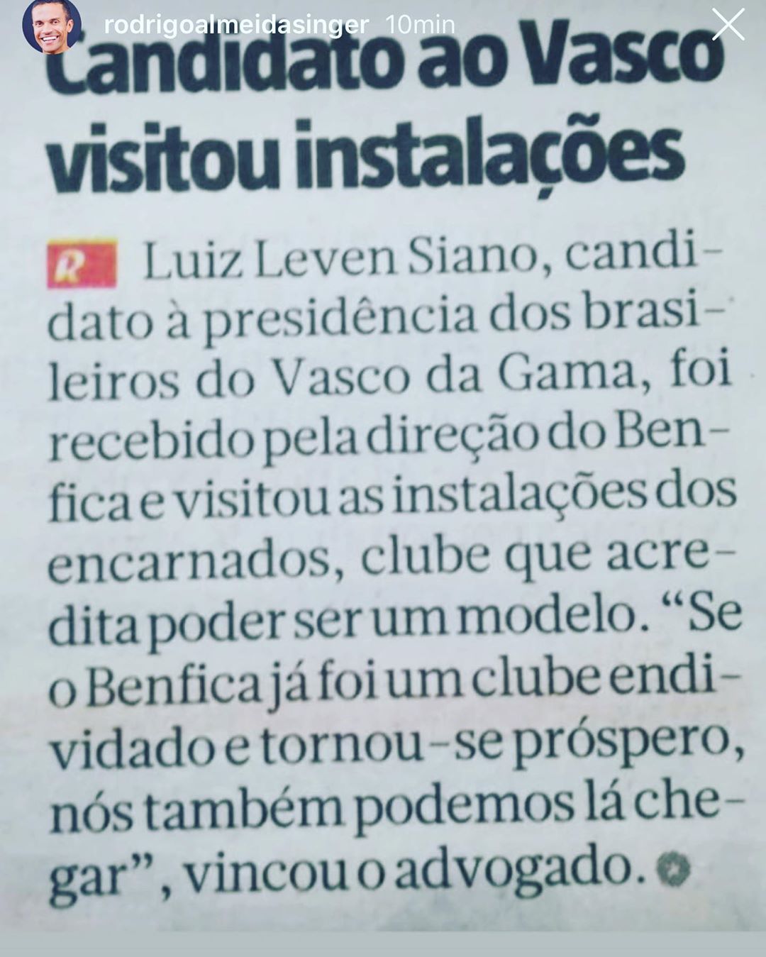 Em visita ao Benfica, Leven Siano diz à imprensa portuguesa que vê clube como modelo para o Vasco