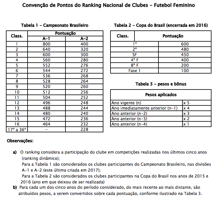 O ranking é estabelecido a partir de um cálculo sobre o desempenho dos clubes nas competições recentes. Além da relação das equipes apresentada no Ranking Nacional de Clubes de Futebol Feminino, a CBF também compila o Ranking Nacional das Federações. Os documentos estão anexados ao final deste texto.