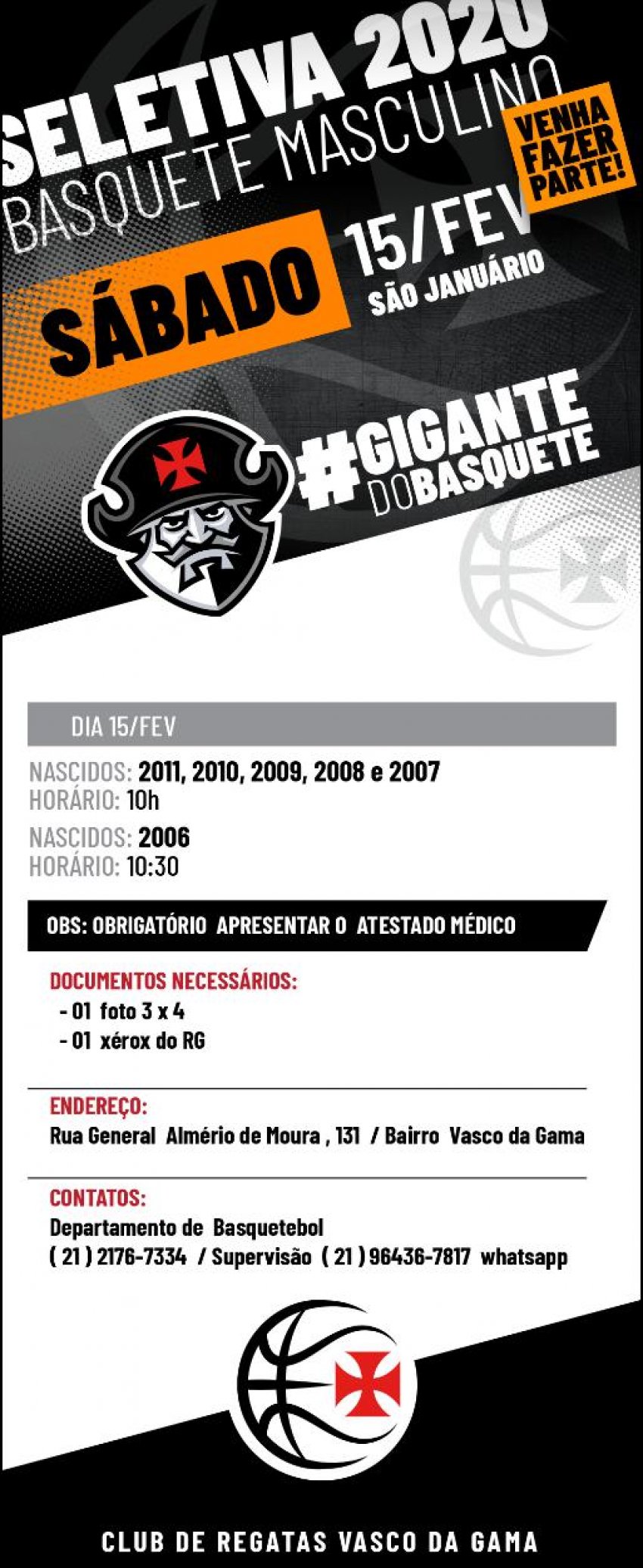 Os documentos necessários são foto 3x4, xerox do RG e é obrigatório apresentar atestado médico. Para maiores informações, o contato com o Departamento de Basquetebol é (21) 2178-7334 / (21) 96436-7817.