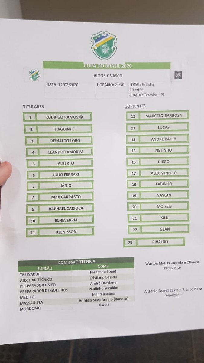 Altos (PI) escalado para enfrentar o Vasco no Albertão.