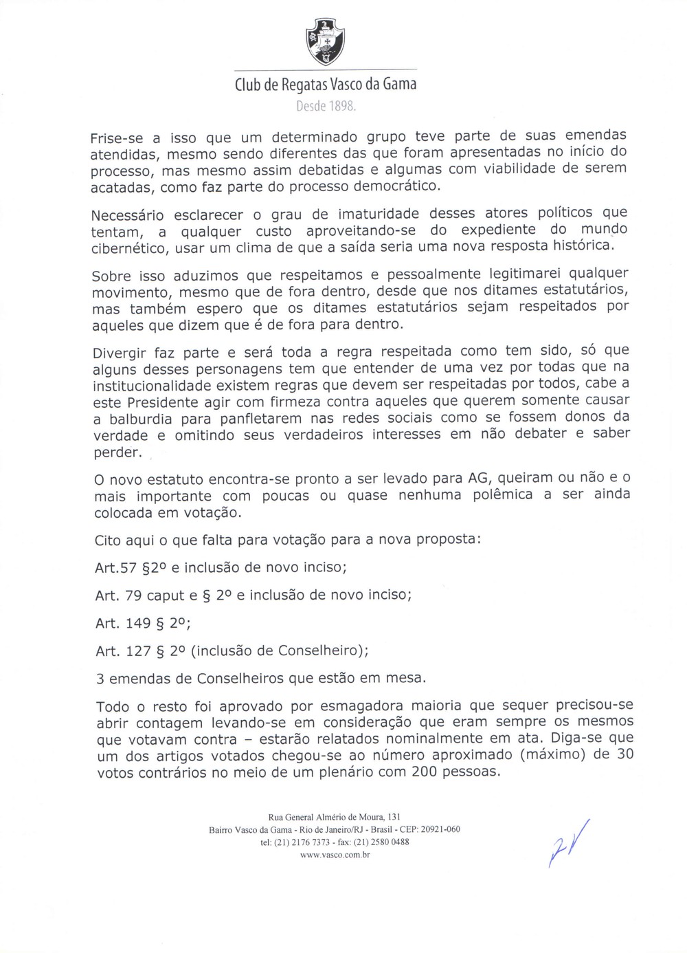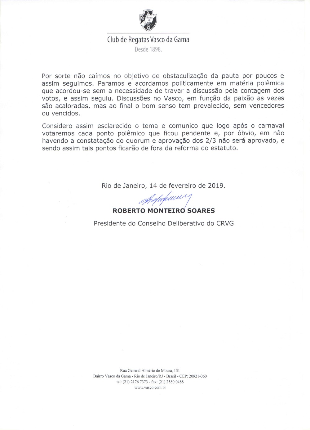 Roberto Monteiro, presidente do Conselho Deliberativo do Vasco, se manifestou nesta quinta-feira, ao divulgar uma nota oficial (veja abaixo), sobre o rito adotado para a avaliação da reforma do estatuto. Ele rebateu críticas que sofreu de outros conselheiros, especialmente no que diz respeito à decisão de deixar os pontos polêmicos para a parte final da votação.