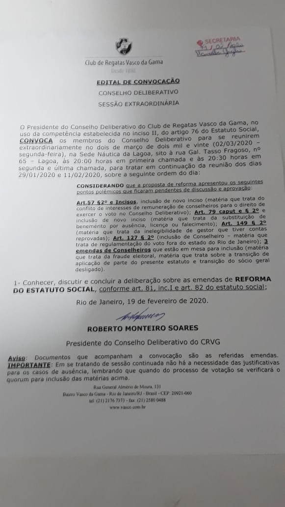 Saiu a convocação da nova e, quem sabe, última reunião para tratar da reforma do estatuto do Vasco.