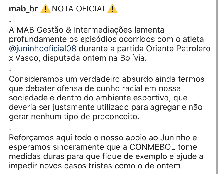 Através do Instagram, o staff de Juninho emitiu nota repudiando o ato de racismo contra o jogador ontem #lanceVAS