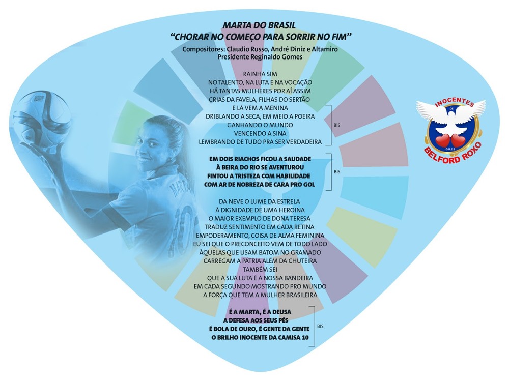 O brilho de Marta nos gramados agora se estenderá pelo tapete nobre da Marquês de Sapucaí. A seis vezes melhor do mundo será o tema do desfile da Inocentes de Belford Roxo, que entra na avenida neste sábado pelo Série A (Grupo de Acesso) - a agremiação será a segunda a entrar - sob o título de "Marta do Brasil - Chorar no começo para sorrir no fim". O carnavalesco da escola, Jorge Caribé, explicou a escolha pelo tema.