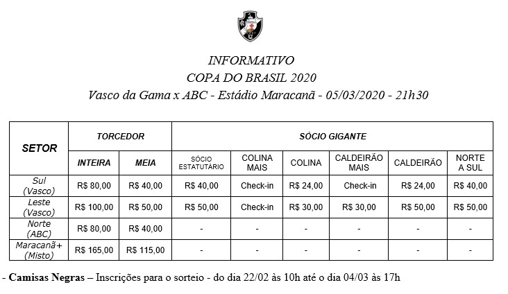 IMPORTANTE: O acesso para sócios será por meio de sua carteirinha social diretamente nas catracas ou pelo voucher que terá que ser OBRIGATORIAMENTE trocado por ingresso físico nas bilheterias de São Januário somente pelo titular do plano apresentando documento de identificação original com foto; Não serão aceitos e-tickets de nenhum tipo nos acessos.
