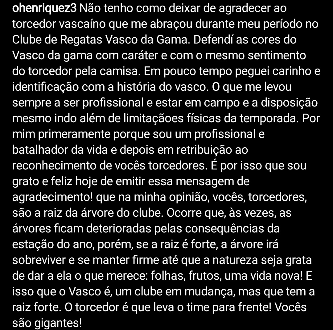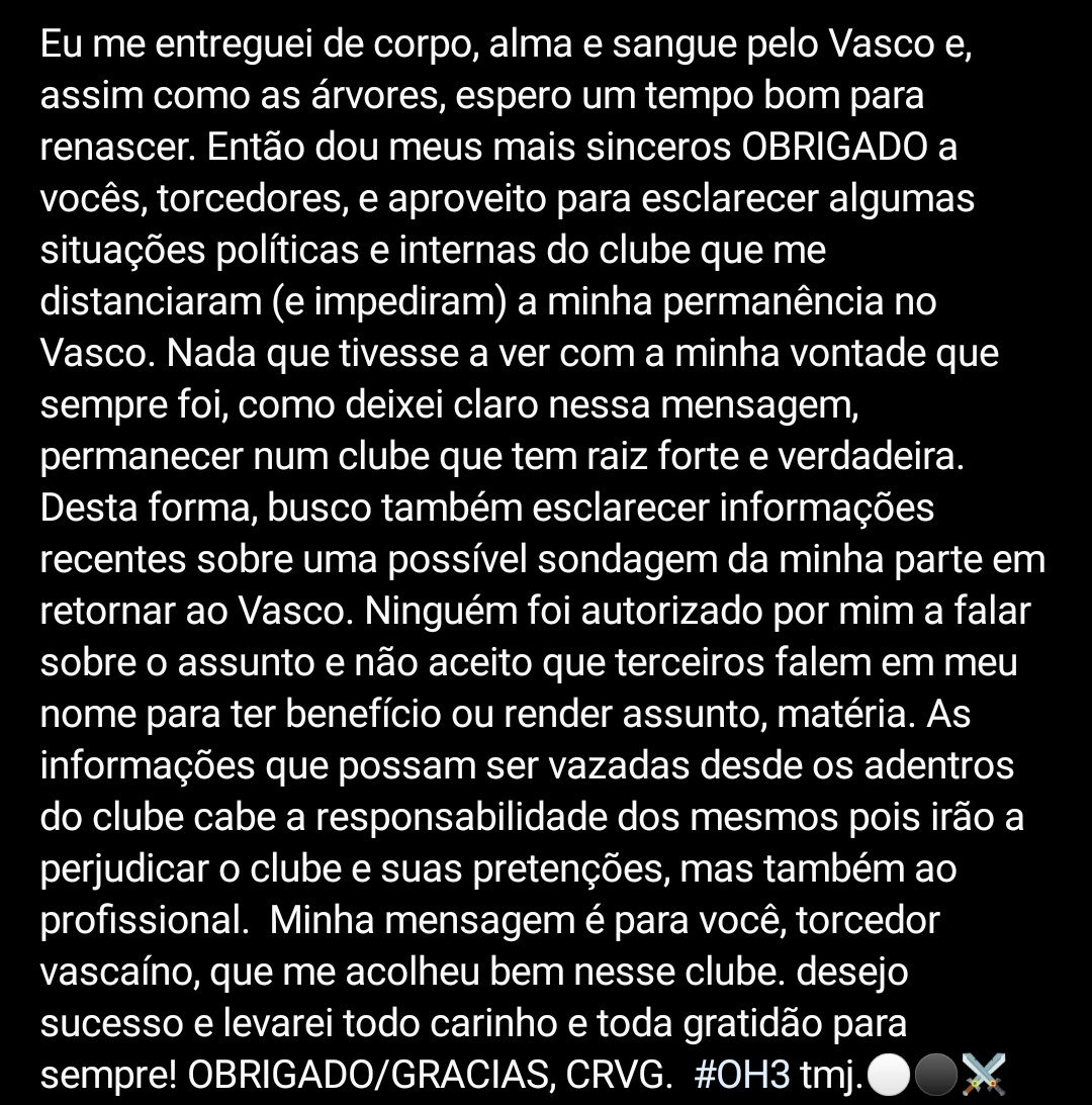 Eu me entreguei de corpo, alma e sangue pelo Vasco e, assim como as árvores, espero um tempo bom para renascer. Então dou meus mais sinceros OBRIGADO a vocês, torcedores, e aproveito para esclarecer algumas situações políticas e internas do clube que me distanciaram (e impediram) a minha permanência no Vasco. Nada que tivesse a ver com a minha vontade que sempre foi, como deixei claro nessa mensagem, permanecer num clube que tem raiz forte e verdadeira. Desta forma, busco também esclarecer informações recentes sobre uma possível sondagem da minha parte em retornar ao Vasco. Ninguém foi autorizado por mim a falar sobre o assunto e não aceito que terceiros falem em meu nome para ter benefício ou render assunto, matéria. As informações que possam ser vazadas desde os adentros do clube cabe a responsabilidade dos mesmos pois irão a perjudicar o clube e suas pretenções, mas também ao profissional. Minha mensagem é para você, torcedor vascaíno, que me acolheu bem nesse clube. desejo sucesso e levarei todo carinho e toda gratidão para sempre! OBRIGADO/GRACIAS, CRVG. #OH3 tmj.⚪️⚫️⚔️