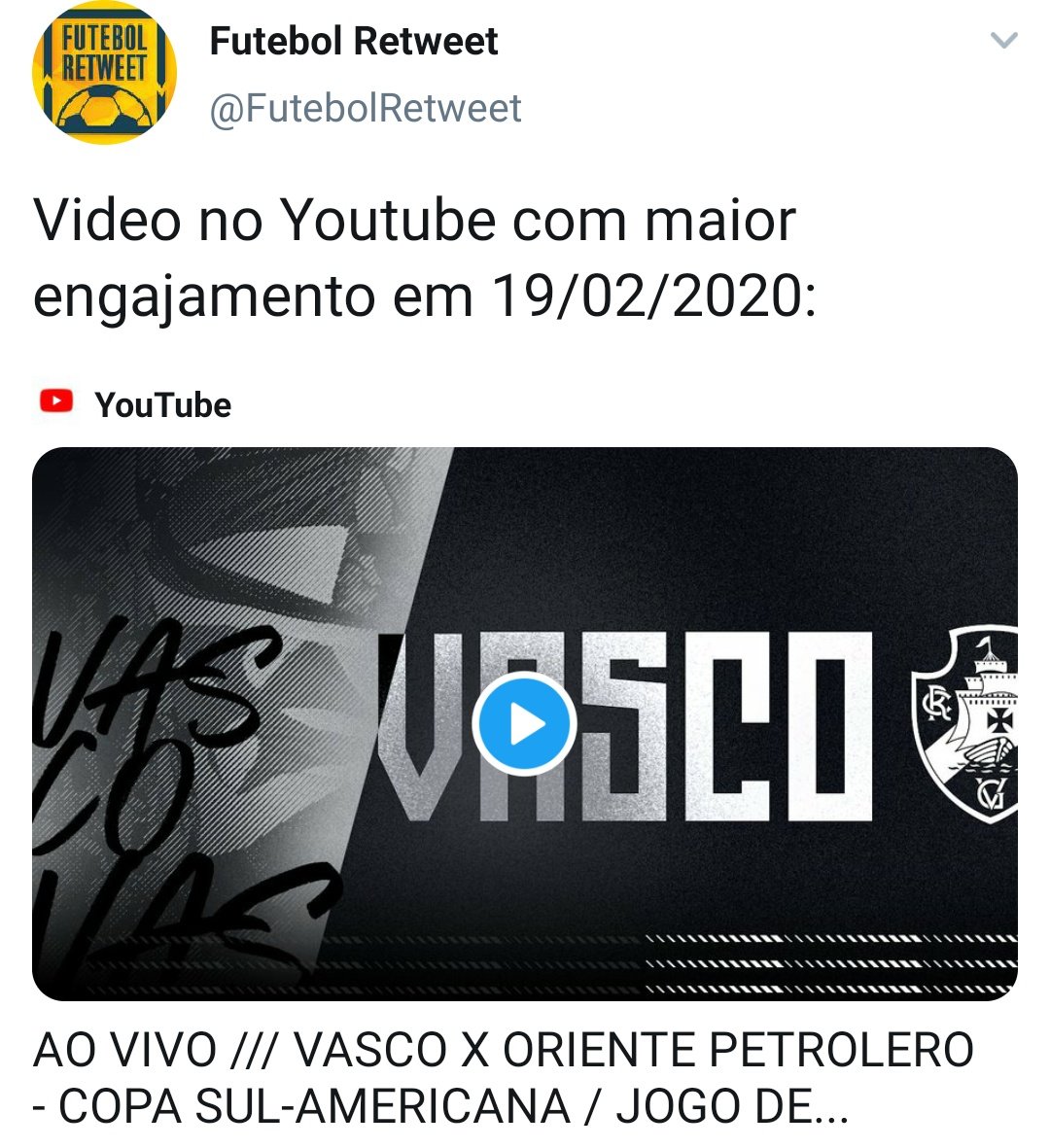 Transmissão do jogo contra o Oriente Petrolero pela VascoTV foi o vídeo de maior engajamento no Youtube no dia 19