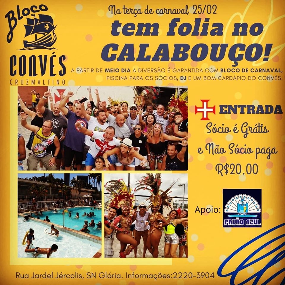 ?Na terça feira de carnaval, a diretoria do Calabouço preparou para os sócios e Vascaínos, um super bailinho de carnaval, com início a partir das 12h. Para divertir a galera, terá DJ e um Bloco super bacana com ritmistas tocando marchinhas e os melhores sambas enredos.?