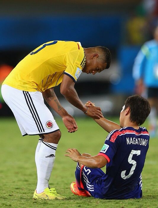 Fredy Guarín e Yuto Nagatomo durante uma partida da Copa do Mundo de 2014, disputada no Brasil.