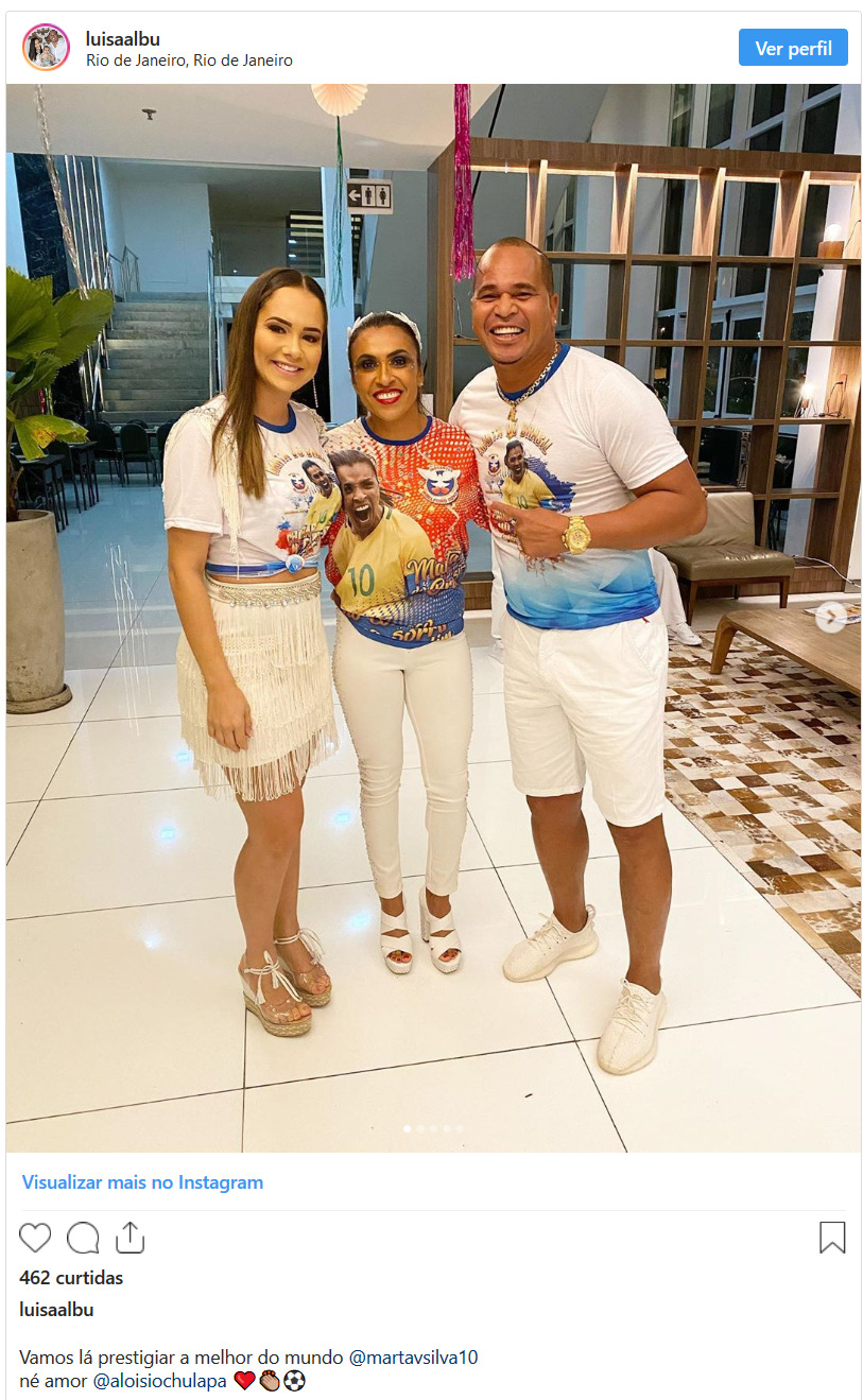 Em outra postagem, ela compartilhou a foto publicada pela mulher de Aloísio, Luisa Albuquerque. Todos devidamente uniformizados com a camisa do enredo "Marta do Brasil - Chorar no começo para sorrir no fim".
