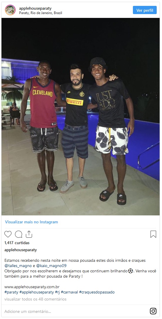 Hospedado em uma pousada de luxo (veja na foto abaixo), o jovem esteve na companhia de seu irmão — o também atacante Kaio Magno — e de alguns outros familiares. O acidente aconteceu enquanto ele se refrescava em uma piscina natural anexa a uma cachoeira. Talles pisou em falso, o que gerou uma entorse no pé esquerdo.