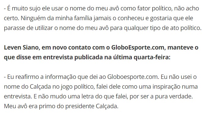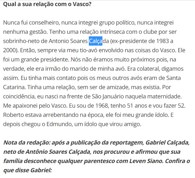 A pedido de Gabriel Calçada, neto de Antônio Soares Calçada, incluímos um manifesto dele na entrevista com o candidato à presidência Luiz Roberto Leven Siano, que afirmou ter parentesco com o ex-presidente vascaíno. Leven também se manifestou. Veja. #gevas