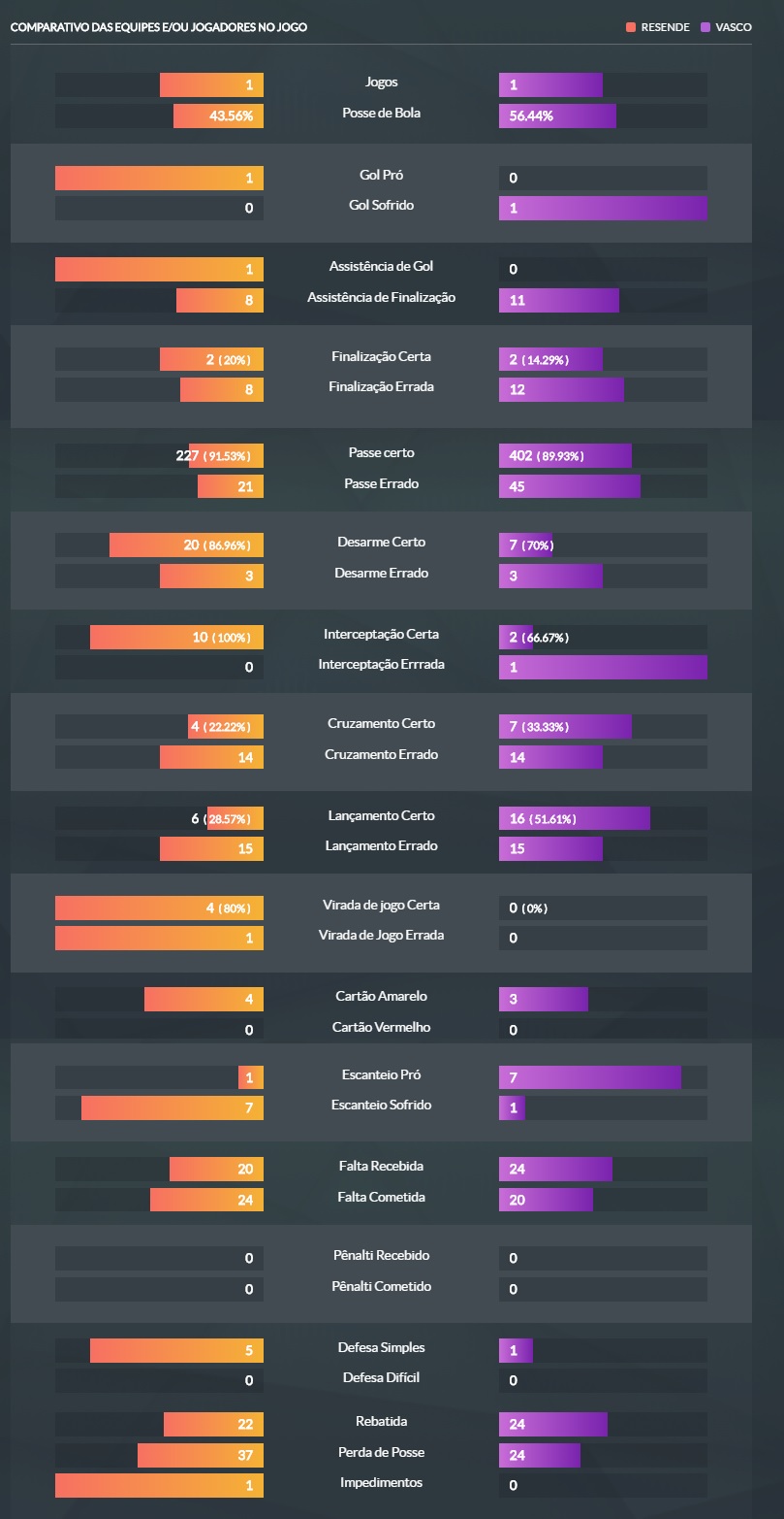 A partir dai, o Resende se fechou e não permitiu as boas jogadas do Vasco. Com muita dificuldade, os cruzmaltinos pouco incomodavam a zaga adversária.