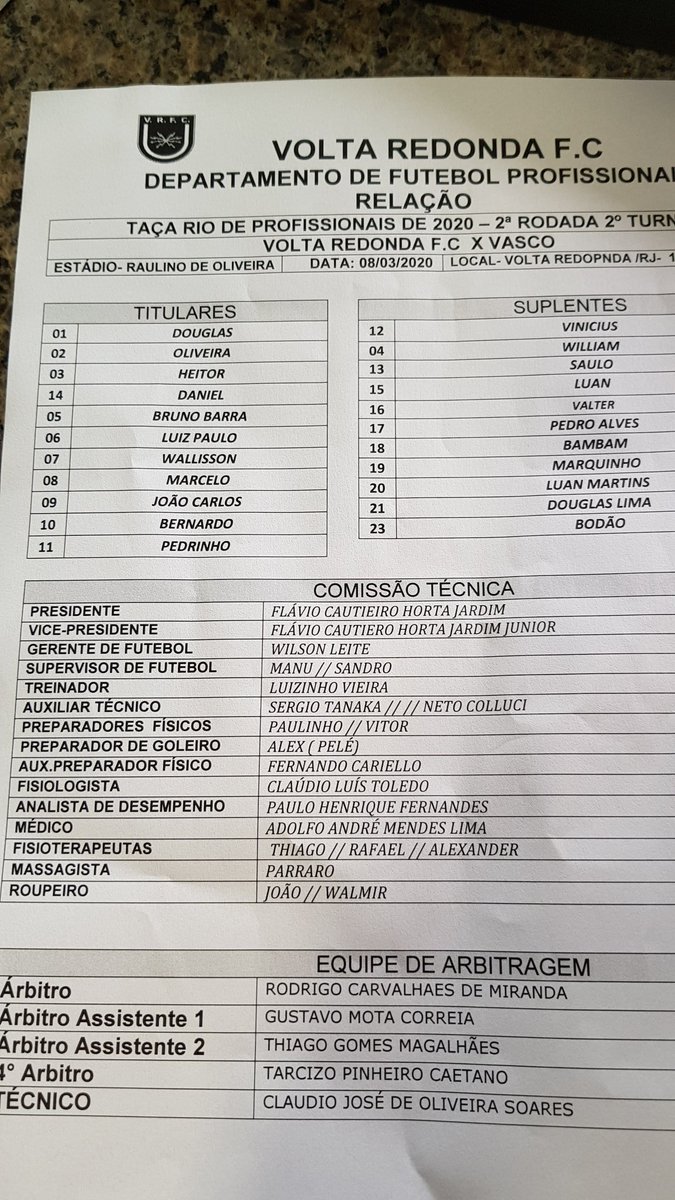 08/03/20 - Confira os desfalques de Vasco e Volta Redonda