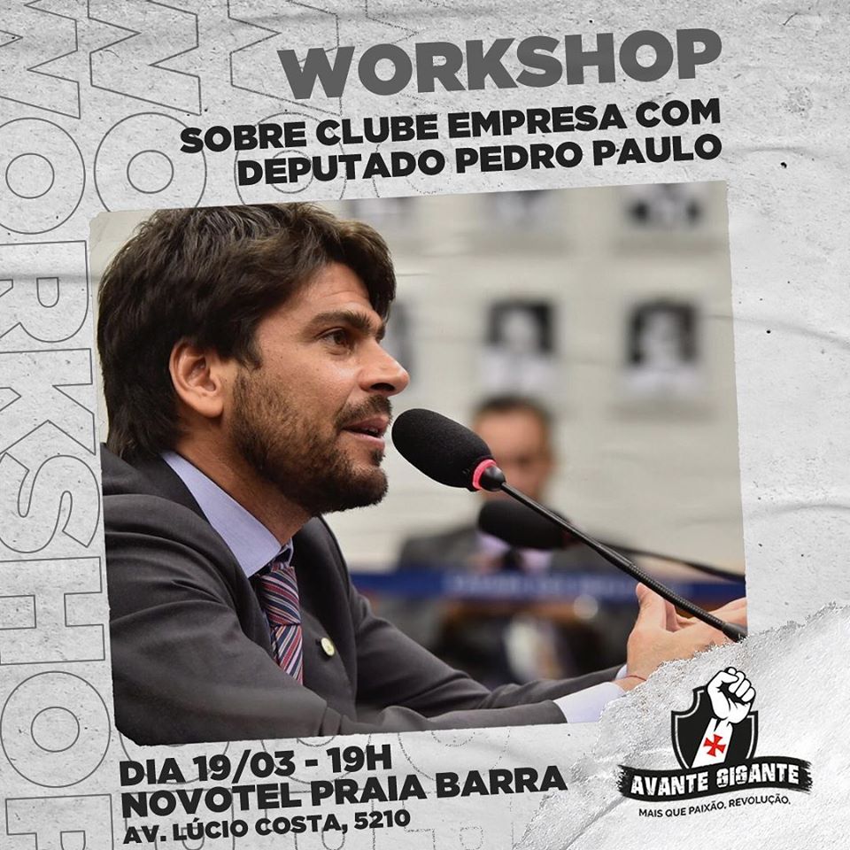 Na quinta-feira, 19/03, o Grupo Avante Gigante dará a sequência na série de workshops que vêm realizando. Em 2019 o Grupo reuniu em várias oportunidades seus integrantes e figuras importantes do âmbito esportivo para debater sobre o projeto de gestão que está sendo confeccionado para o Vasco Da Gama. A próxima oportunidade terá como ponto focal o tema Clube Empresa. Quer participar? Entre em contato via inbox.