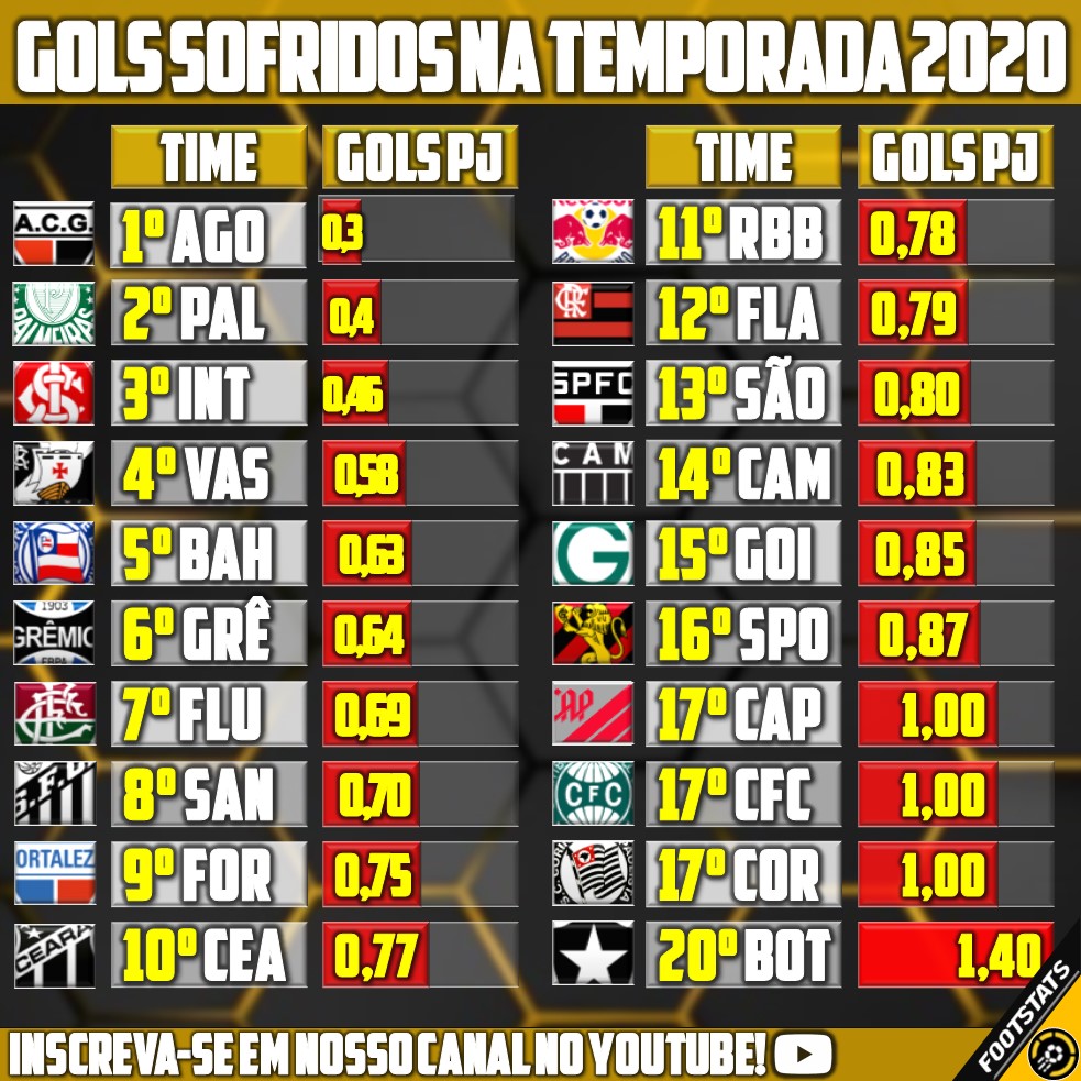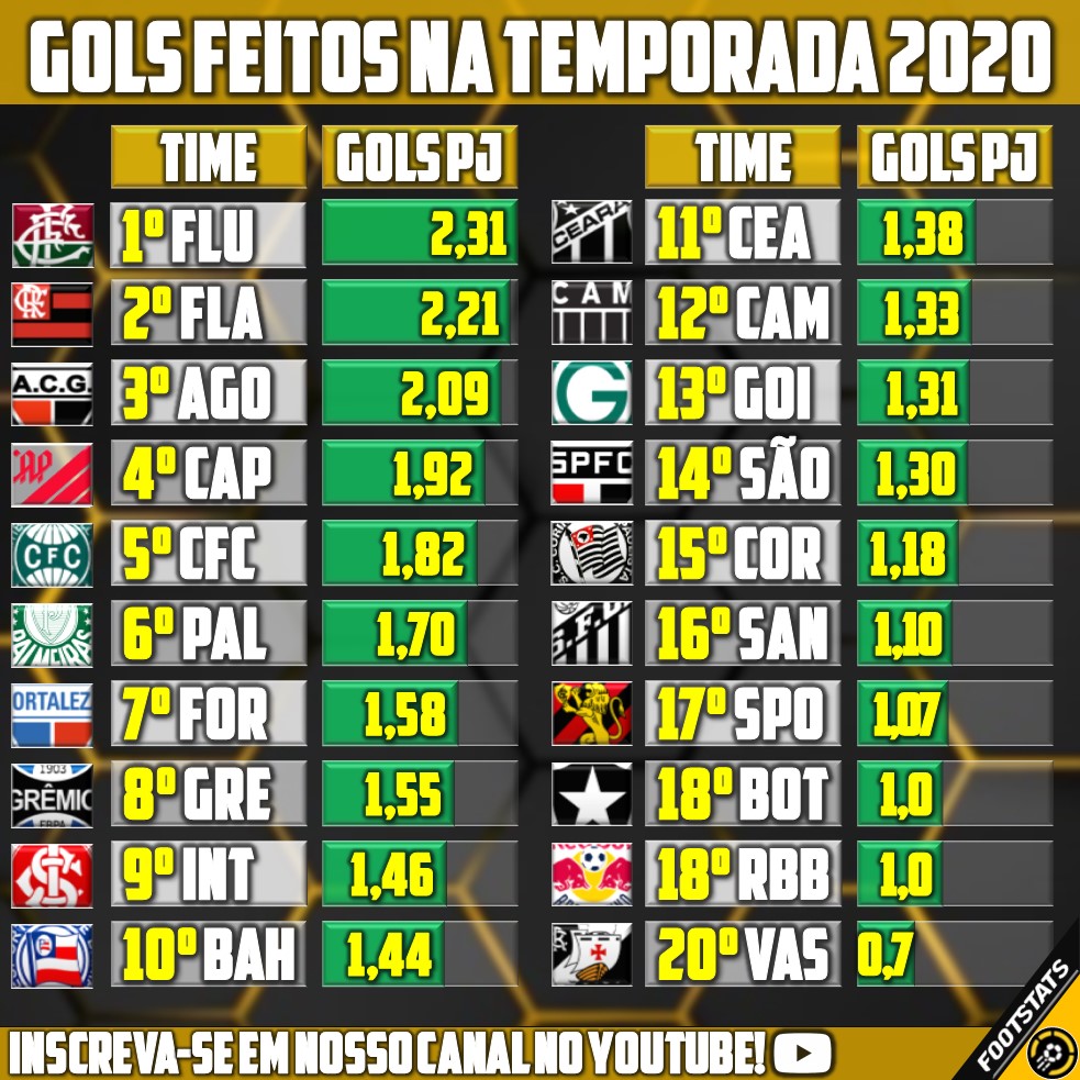 Levantamos a média de gols feitos e de gols sofridos de TODOS os times da Série A na temporada 2020 em jogos oficiais!