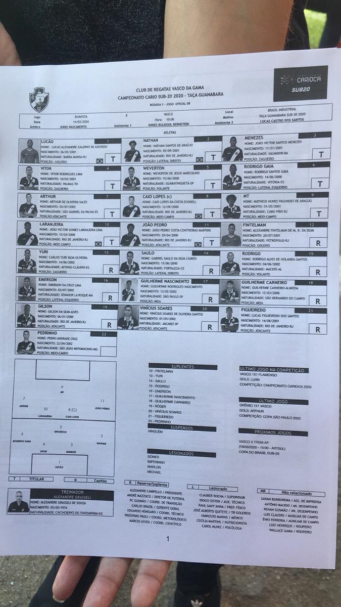 Vasco escalado para enfrentar o Boavista, às 10h, na estreia do Carioca Sub-20, em Paracambi: Lucão, Nathan, Menezes, Vitor e Rodrigo Gaia; Weverton, Caio Lopes (C) e João Laranjeira; Arthur Sales, MT e João Pedro;