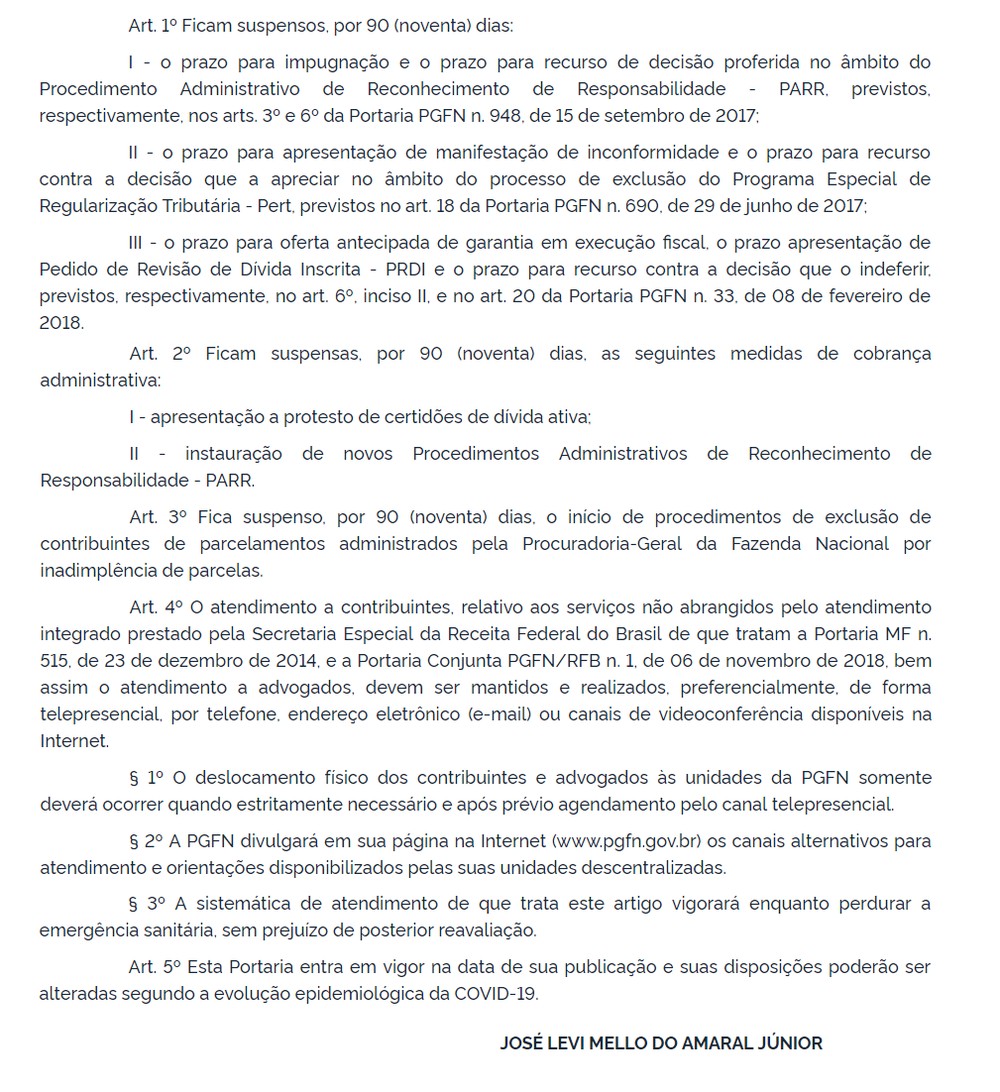 A Procuradoria-Geral da Fazenda Nacional suspendeu pelos próximos 90 dias os atos de cobrança da dívida ativa da União, devido ao estado de pandemia do novo Coronavírus, declarado pela Organização Mundial da Saúde (OMS). A adequação vale, também, para os 26 clubes das Séries A e B do Brasileiro que possuem passivos tributários e previdenciários com a entidade.