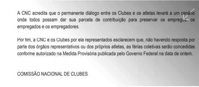 A primeira proposta apresentada pela Comissão Nacional dos Clubes indicava concessão de 30 dias de férias aos atletas a contar desta segunda-feira (24), pagamento de 50% das férias agora e os outros 50% em dezembro, segurar o Campeonato Brasileiro até 23 de dezembro e redução do salário nesse período de 50%.