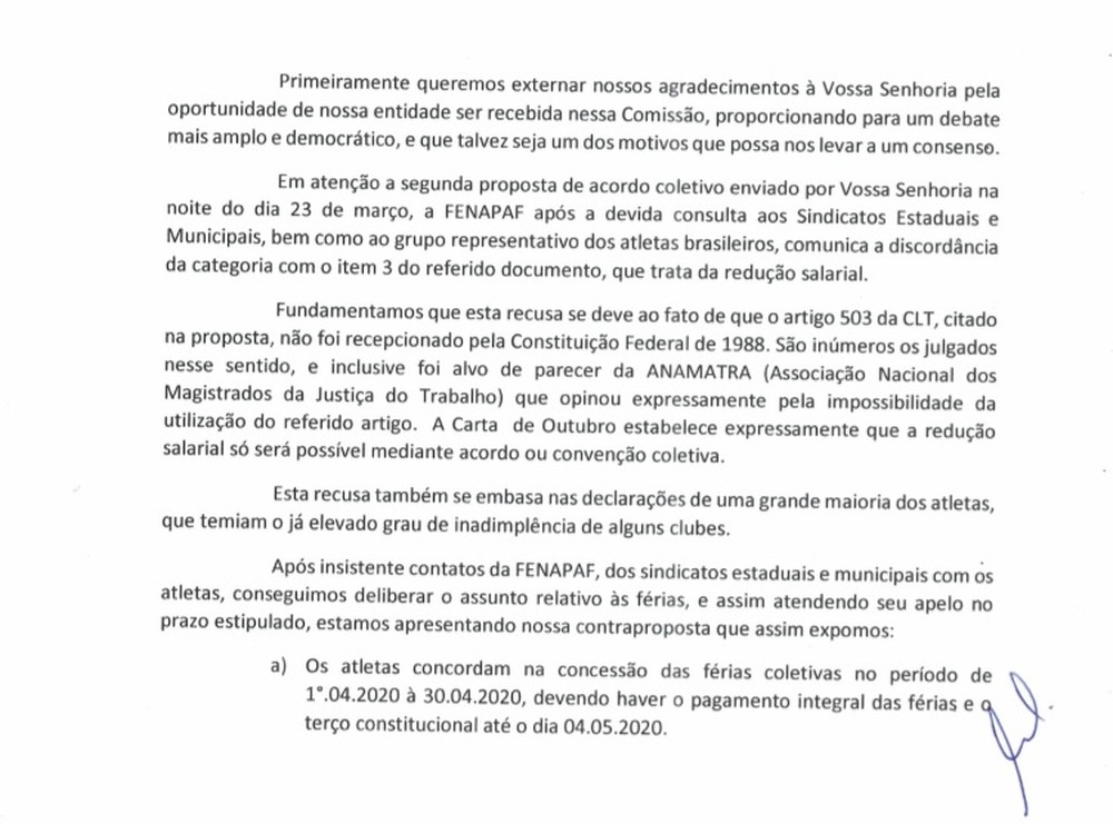 A proposta de férias coletivas foi ajustada na resposta dos atletas. A entidade que representa os atletas aceita 30 dias de férias - entre 1 e 30 de abril, mas com pagamento integral das férias e o terço constitucional até o dia 4 de maio.