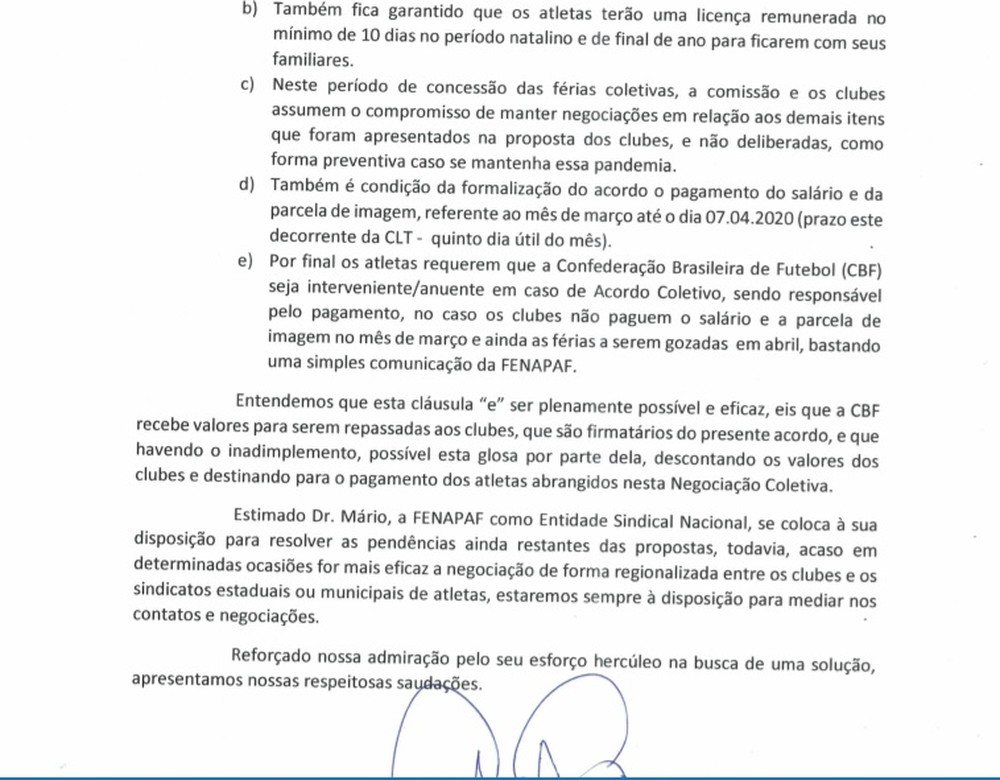 Por fim, os atletas pedem garantias caso os clubes não acertem o pagamento. Cobram da CBF ser avalista deste acordo, "no caso dos clubes não paguem o salário e a parcela de imagem no mês de março e ainda as férias a serem gozadas em abril".