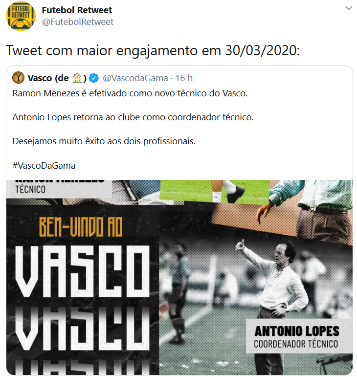 Anúncio de Ramon como novo técnico do Vasco foi o tweet com maior engajamento do dia 30 de março