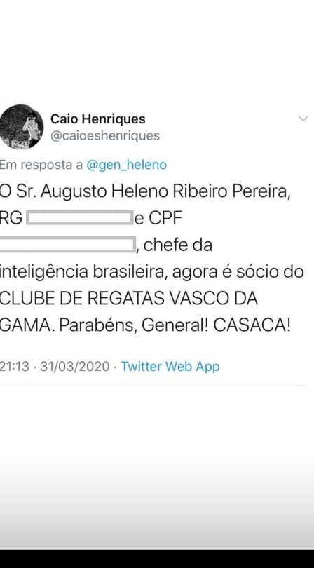 O ministro do Gabinete de Segurança Institucional (GSI), general Augusto Heleno, publicou em suas redes sociais seu exame para mostrar que não estava mais com coronavírus. Mas, por descuido, divulgou o documento com seus números de CPF e RG visíveis. Após a falha, o exame foi republicado já com os dados pessoais borrados. Mas já era tarde. Os internautas não deixaram passar a chance de fazer piada com o episódio e disseram ter usado as informações para inscrever o ministro como sócio do Vasco e até como assinante do pay-per-view do BBB.