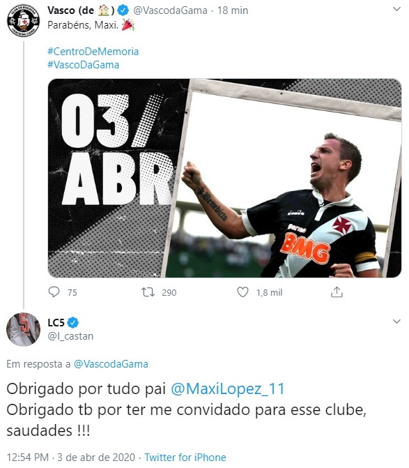 03/04/20 - Via rede social, Vasco parabeniza Maxi López, aniversariante do dia