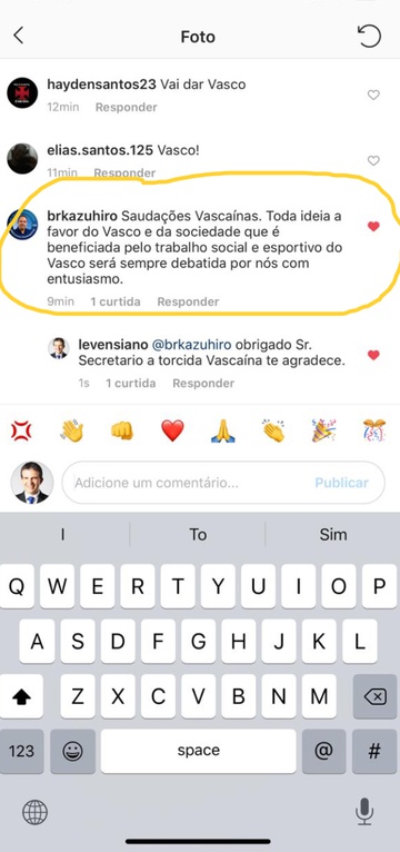 "Saudações vascaínas. Toda ideia do Vasco e da sociedade que é beneficiada pelo trabalho social e esportivo do Vasco será sempre debatida por nós com entusiasmo".