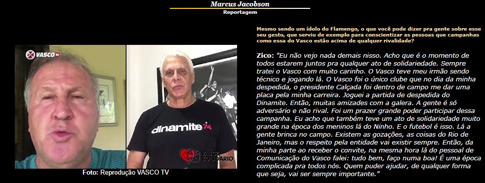 A campanha de solidariedade que o Vasco lançou está tendo boa repercussão. Chama a atenção, em meio a muitos vascaínos, a participação de Zico, ídolo do rival. Hoje conversei com ele para falar mais sobre esse seu gesto. Atencioso, elogiou o Vasco e sua iniciativa. Confira!