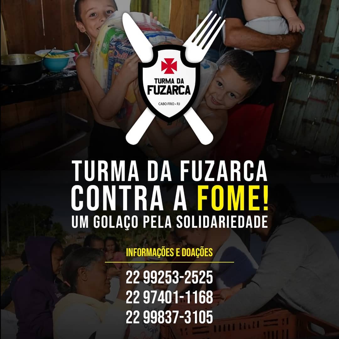 A Turma da Fuzarca de Cabo Frio-RJ, convoca todos os irmãos Vascaínos, com os seus familiares e amigos, para juntos fazermos uma corrente do bem. A nossa ação dessa vez, será juntar alimentos para uma grande doação que faremos no domingo de Páscoa. Você pode doar cesta básica, alimentos, ou fazer uma doação em dinheiro para a conta do nosso parceiro, o Mercado Tropical.
