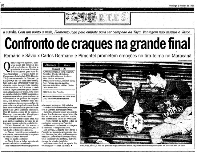 O jogo mais importante foi um Vasco x Botafogo (em 1991). Ainda era júnior. Se não me engano, o Luiz Carlos Winck se machucou ou teve algum problema de cartão e o reserva também estava com um problema. Então fui solicitado para jogar. Empatamos em 3 a 3, foi aquela alegria total apesar de eu ter saído no intervalo. Eu tinha uma expectativa muito grande de pisar no Maracanã e fazer meu primeiro jogo.