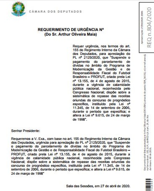 O Projeto de Lei 2125/2020, do deputado Arthur Oliveira Maia (DEM-BA), provocou a reação da classe de jogadores. Em grupos de Whatsapp e com a participação de sindicatos de atletas, eles iniciaram movimento para colher assinaturas virtuais e enviar documento com a contestação da proposta. O principal ponto é a redução de 50% na cláusula compensatória em caso de rescisão contratual.