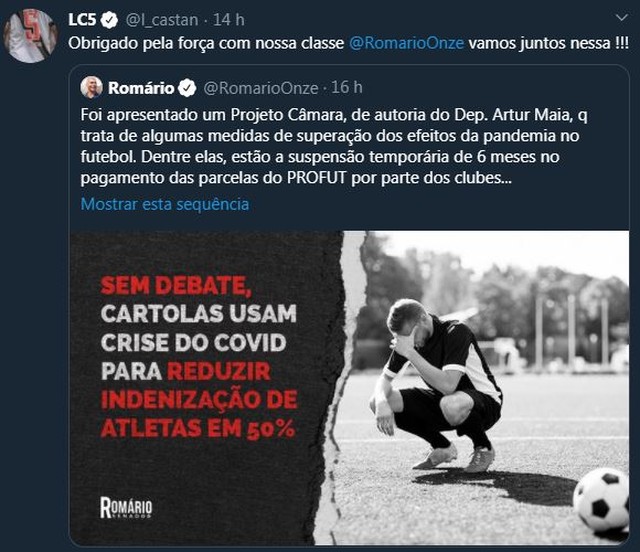 - Uma coisa é tentar negociar alguma redução salarial durante a paralisação. Outra é querer, por uma manobra, criar uma espécie de salvo-conduto para que continuem a endividar irresponsavelmente seus clubes com contratos altíssimos, para depois jogar o calote na mão dos atletas. Não podemos aceitar isso. Estou certo de que os Deputados e as Deputadas saberão ver esse absurdo e retirá-lo do Projeto do Dep. Artur Maia. Alguns de nossos dirigentes precisam, de uma vez por todas, parar de usar o calote como ferramenta de (má) gestão - escreveu Romário.