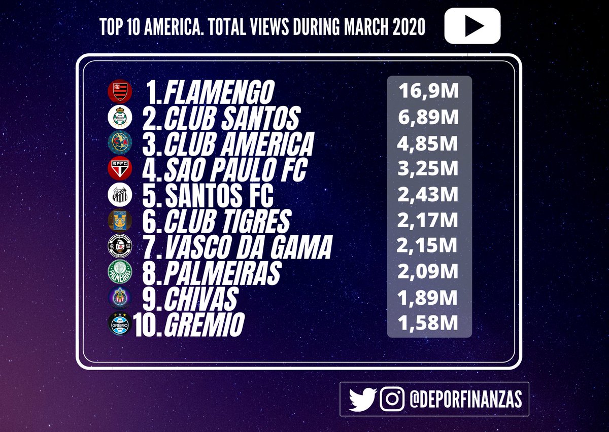 ?⚽ ¡Los 10 clubes de América con más visualizaciones en #youtube durante marzo 2020! ⏯