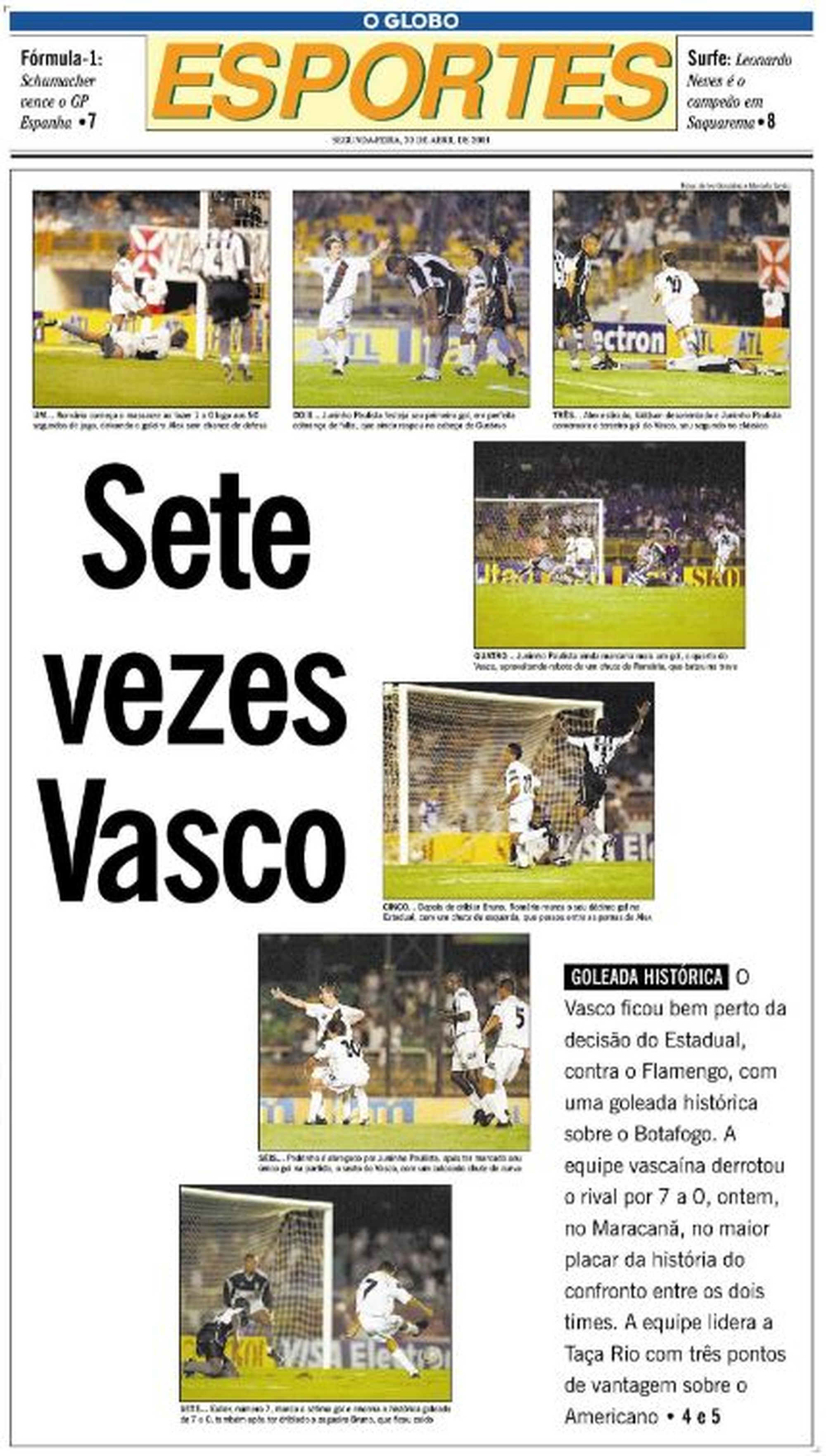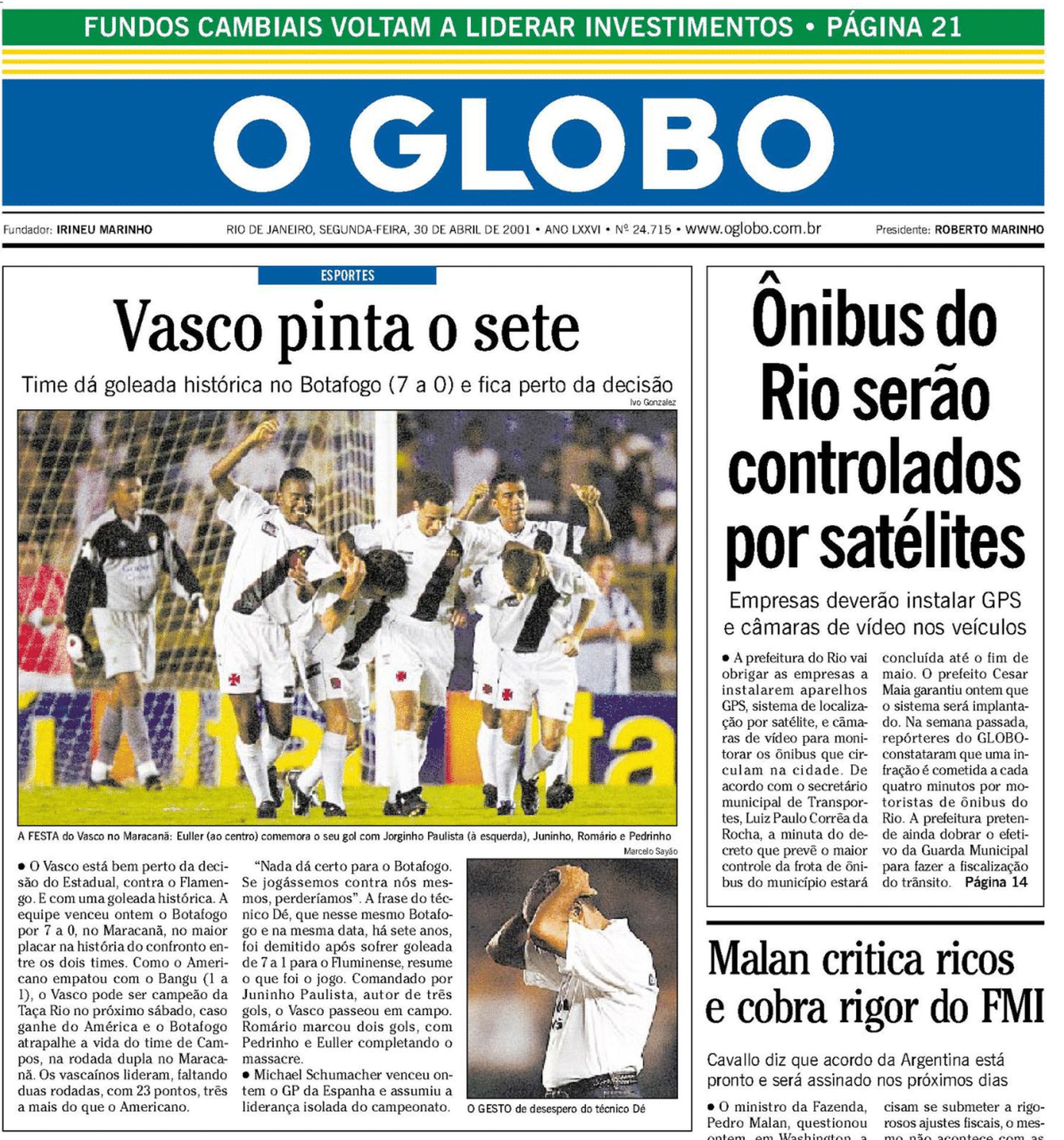 O cofre recheado, que resultou em investimento milionário no futebol, não era mais o mesmo, mas o Vasco ainda ostentava alguns craques além do fato de ser o atual campeão brasileiro e da Mercosul. Há exatos 19 anos, em 29 de abril de 2001, com um time que ainda se impunha sobre os rivais, o Cruz-Maltino aplicou 7 a 0 sobre o Botafogo pelo Campeonato Carioca.