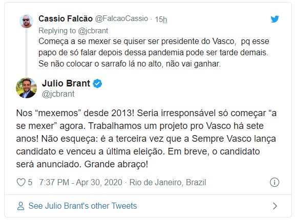 Diante desse cenário, Júlio resolveu dar uma resposta para os vascaínos, através das redes sociais. Deixou claro que o trabalho do seu grupo não iniciou hoje e afirmou que a ''Sempre Vasco'' vem planejando um projeto há muito tempo para o Gigante da Colina.