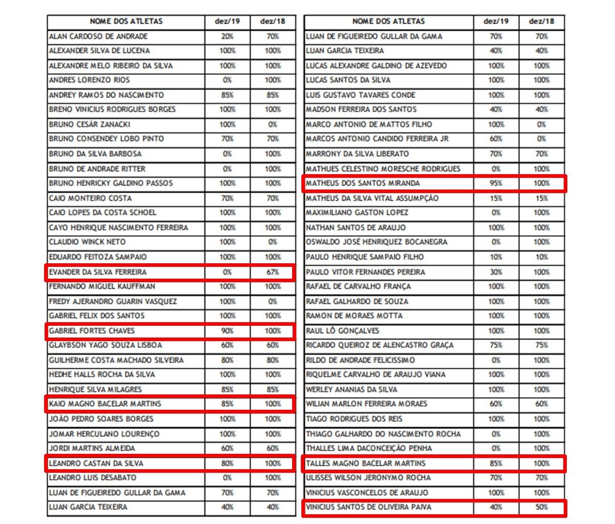 O Balanço Patrimonial divulgado pelo Vasco compara a porcentagem dos direitos econômicos que o clube detém dos atletas em dezembro de 2018 com dezembro de 2019. Uma porcentagem que o clube teria mantido por Evander não consta mais no relatório.