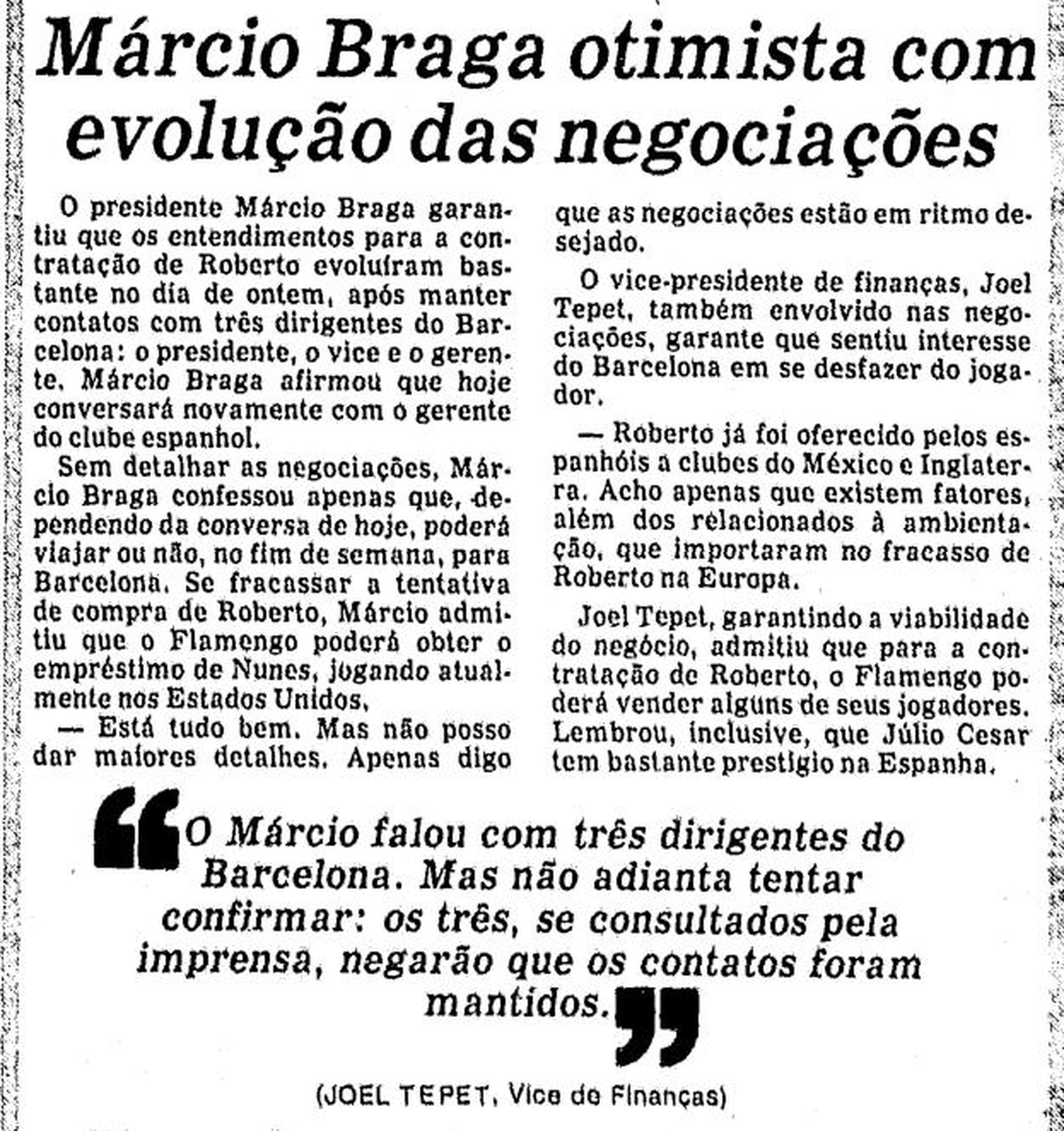 Queríamos trazer o Roberto para o Flamengo. Ele topou. Mas tinha um grande problema: 700 mil dólares (risos). O Roberto já tinha recebido a parte dele na negociação com o Barcelona, mas o Vasco nada. Eles tinham que pagar os 700 mil dólares para o Vasco.