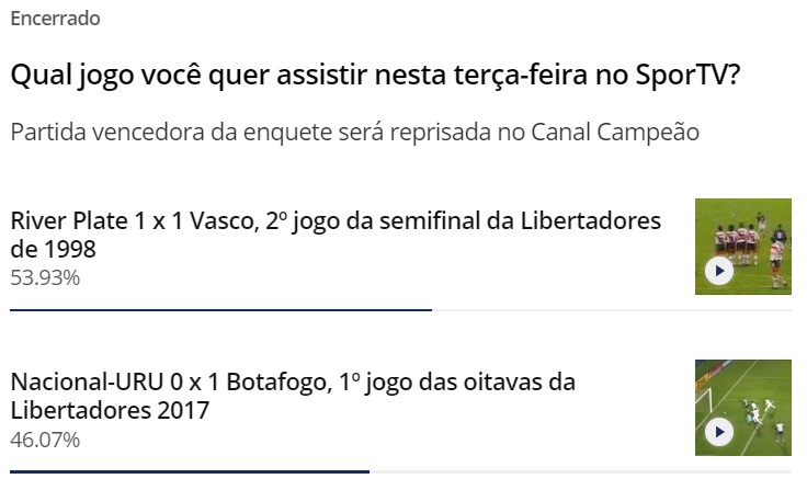 04/05/20 - Sportv abre votação para VT que exibirá nesta 3ª; uma das opções é River Plate x Vasco pela Libertadores de 1998