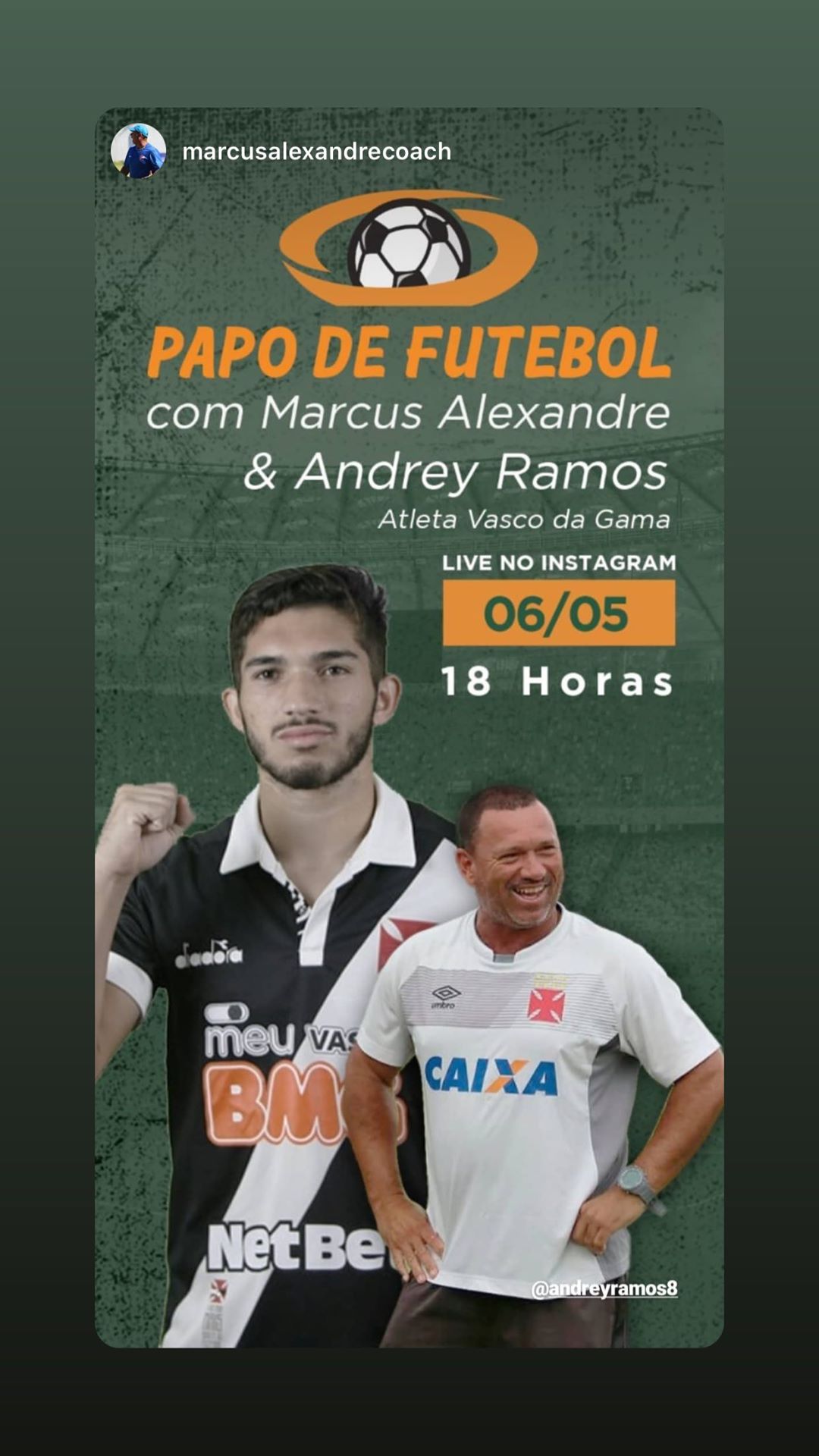 Andrey participa de live com o ex-técnico da base do Vasco Marcus Alexandre nesta 4ª-feira às 18h