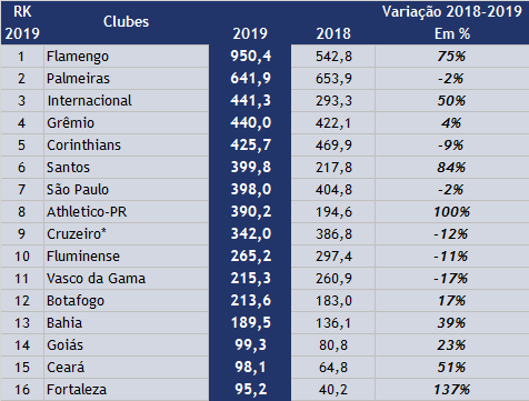 Ranking 2019 – Receitas dos clubes – R$ milhões