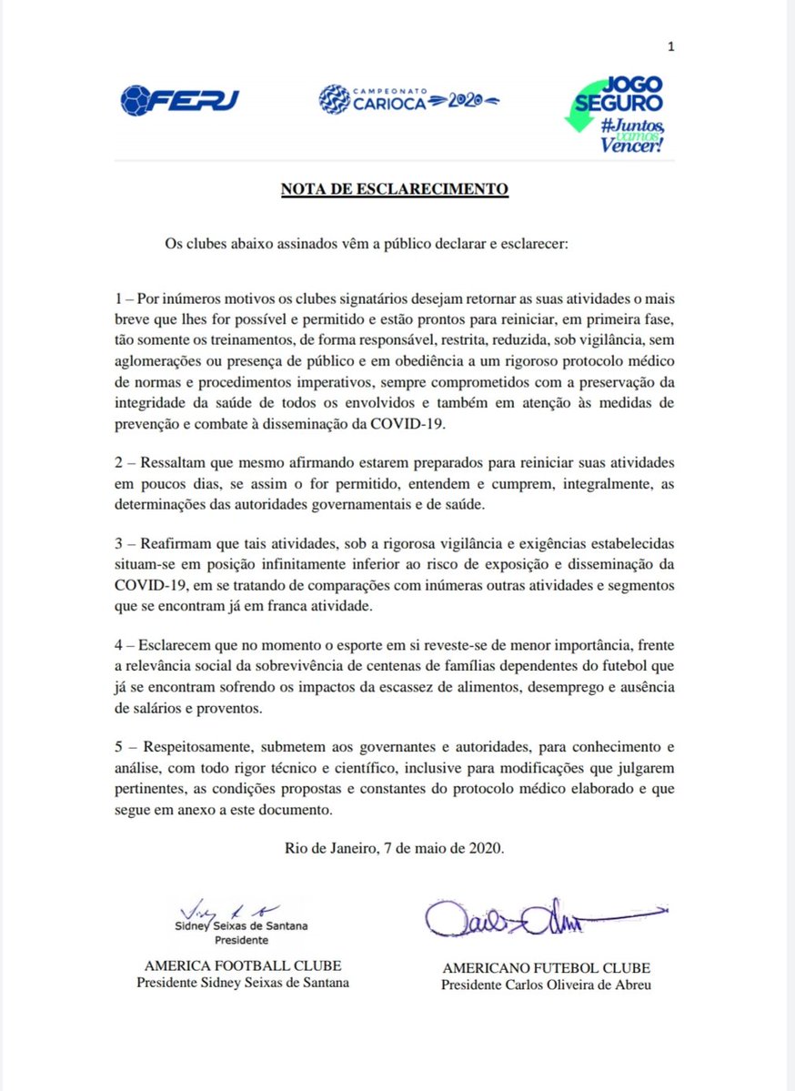No texto, federação e os clubes signatários argumentam que estão prontos para reiniciar os treinamentos "de forma responsável, restrita, reduzida, sob vigilância, sem aglomerações ou presença de público e em obediência a um rigoroso protocolo médico".