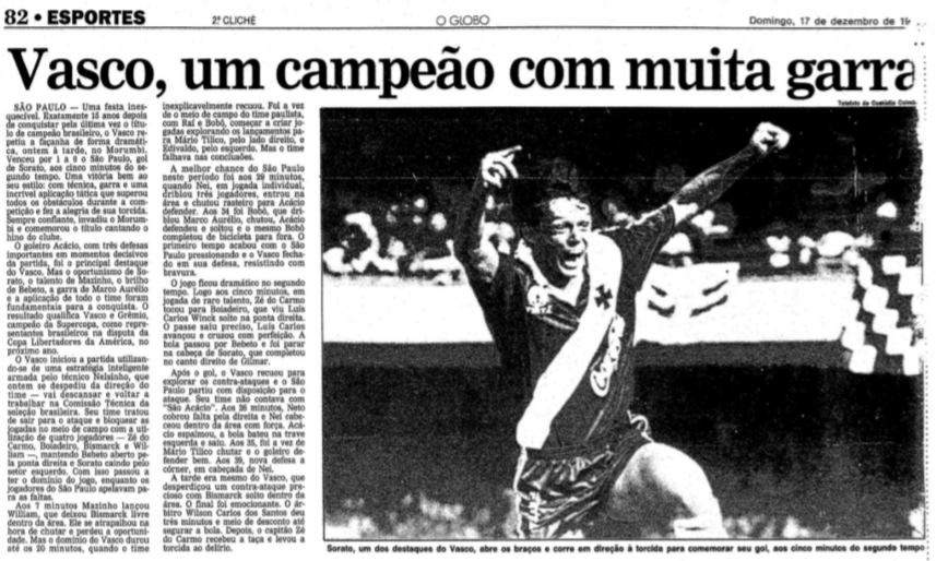 Aquele time era chamado de "SeleVasco", por contar com vários jogadores que tinham passagem pela Seleção Brasileira. O elenco contava com nomes como Acácio, Luís Carlos Winck, Mazinho, Bismarck e Bebeto, por exemplo. E quem decidiu aquele jogo foi Sorato, então garoto de 20 anos, que surgia com uma estrela muito forte, marcando gols decisivos naquele início de carreira. Mas o cara daquele jogo divide os méritos e lembra da pressão do São Paulo, que também possuía um grande elenco, com nomes como Gilmar, Ricardo Rocha, Bobô, Mário Tilico e Raí.